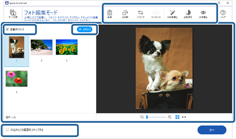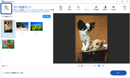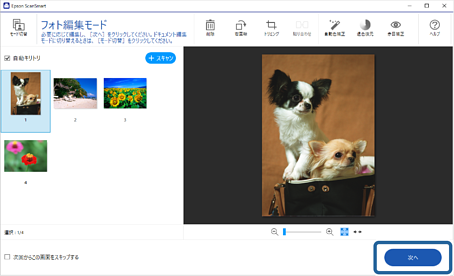 ここでは、例として[おまかせモード]で写真をスキャンしてJPEGファイルに保存する手順を説明します。
