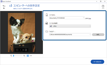 ファイルの命名方法を変更できます。[戻る]をクリックして[保存先の選択]画面に戻り、[設定]をクリックしてください。[ファイル名の設定]タブをクリックしてファイルの命名方法を変更します。