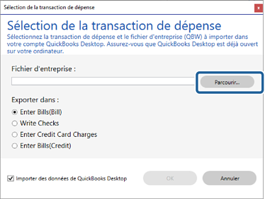 Cliquez sur Parcourir et sélectionnez le fichier d’entreprise (.qbw) dans lequel seront exportées et enregistrées les données.