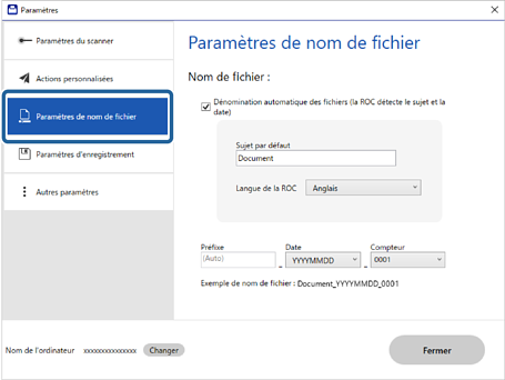 Sélectionnez Dénomination automatique des fichiers (la ROC détecte le sujet et la date) pour que le nom du fichier soit saisi automatiquement.