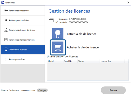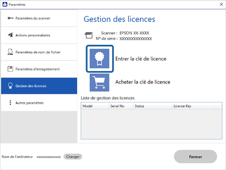 Paramètres dans la fenêtre Epson ScanSmart > onglet Gestion des licences.