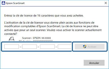 Vous pouvez acheter une clé de licence et activer Invoice/Receipt Manager pour pouvoir utiliser toutes les fonctions d’Epson ScanSmart.