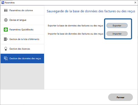 Paramètres dans la fenêtre Invoice/Receipt Manager > onglet Sauvegarde de la base de données des factures ou des reçus > Exporter ou Importer.