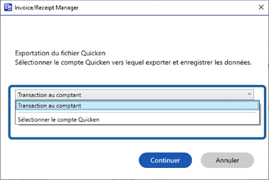 Sélectionnez Transaction au comptant ou le compte Quicken où seront exportées et enregistrées les données.