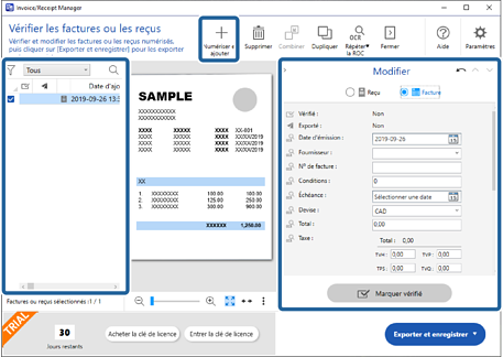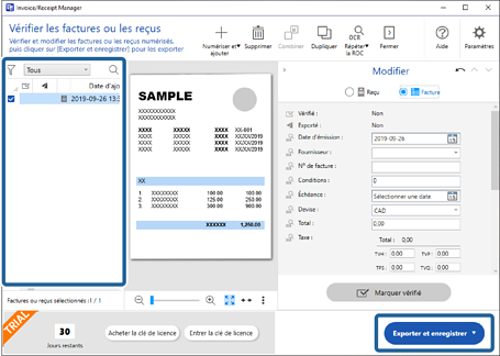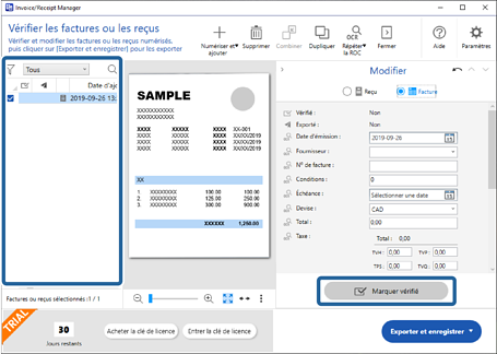 Double-cliquez sur la facture ou le reçu dans la liste ou cliquez sur Modifier et vérifier pour afficher la fenêtre Modifier.