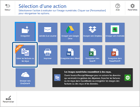 Cliquez sur Gérer les factures ou les reçus dans la fenêtre Sélection d'une action.