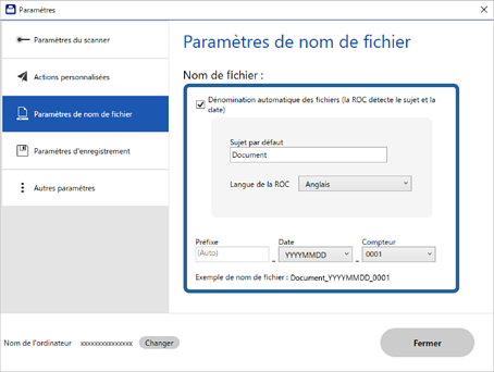 Sélectionnez Dénomination automatique des fichiers (la ROC détecte le sujet et la date) pour que le nom du fichier soit saisi automatiquement.