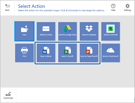 Abra Epson ScanSmart y luego haga clic en una de las opciones de DIGITALIZAR.