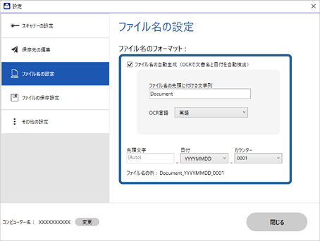ファイル名を自動で付与したい場合は[ファイル名の自動生成(OCRで文書名と日付を自動検出)]にチェックを入れます。