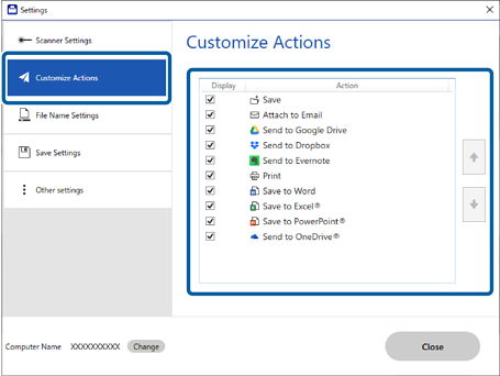 Definições na janela Epson ScanSmart, e a seguir selecione o separador Ações personalizadas.