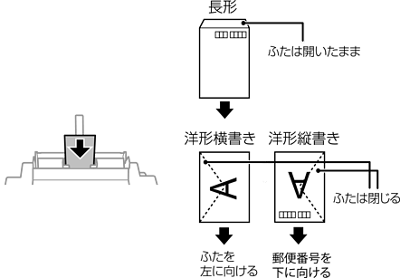 下トレイにセットするときは、印刷する面を下にして、図の矢印の向きで用紙トレイの奥に突き当ててセットします。その後用紙ガイドを封筒の側面に合わせてください。