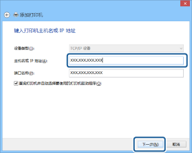 在[主機名稱或 IP 位址]或[印表機名稱或 IP 位址]輸入印表機的 IP 位址或印表機名稱,然後按下[下一步]。