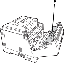 You can see the duplexing unit and the duplexing unit cover by opening the front cover using button B. The asterisk (*) indicates the position of the caution label.