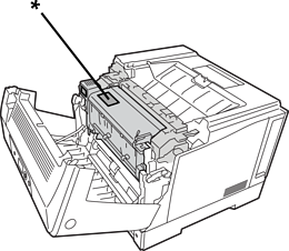 You can see the fuser unit by opening the front cover using lever A. The asterisk (*) indicates the position of the caution label.