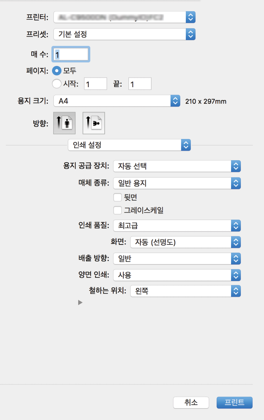 인쇄 설정 메뉴가 macOS Catalina (10.15) 또는 이후 버전, macOS 높게 Sierra (10.13), macOS Sierra (10.12), OS X El Capitan (10.11), OS X Yosemite (10.10), OS X Mavericks (10.9), OS X Mountain Lion (10.8)에 표시되지 않는 경우, Epson 프린터 드라이버가 올바르게 설치된 상태가 아닙니다. 다음 메뉴에서 활성화하십시오.