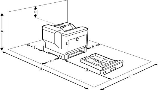 Quando deslocar a impressora, escolha sempre um local com espaço suficiente para permitir uma fácil utilização e manutenção. Utilize a ilustração seguinte como guia para a quantidade de espaço necessário à volta da impressora para garantir um bom funcionamento.