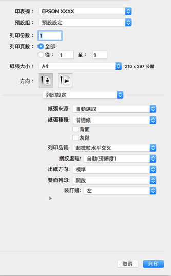 若在 macOS Catalina (10.15) 或更新版本、macOS High Sierra (10.13)、macOS Sierra (10.12)、OS X El Capitan (10.11)、OS X Yosemite (10.10)、OS X Mavericks (10.9)、OS X Mountain Lion (10.8) 中沒有顯示 [列印設定] 功能表,則表示 Epson 印表機驅動程式沒有正確安裝。從下列功能表中啟用它。