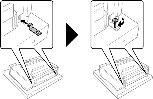 Use screws to secure the two metal hooks to the back of the printer as shown below.