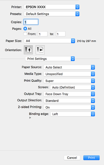 Jika menu Pengaturan Cetak tidak ditampilkan di macOS Catalina (10.15) atau versi sesudahnya, macOS High Sierra (10.13), macOS Sierra (10.12), OS X El Capitan (10.11), OS X Yosemite (10.10), OS X Mavericks (10.9), OS X Mountain Lion (10.8), itu artinya driver printer Epson belum diinstal dengan benar. Aktifkan dari menu berikut.