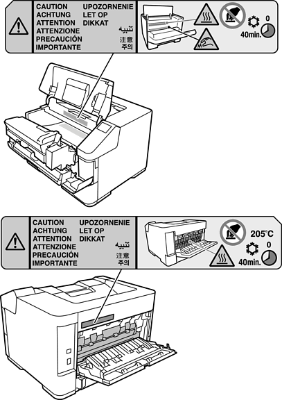 Never touch the areas inside the printer that are marked with caution labels. The inside is very hot and high temperature may cause burns. There are sharp edges around the transfer roller that could injure your fingers.