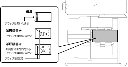 印刷する面を上にしてセットし、用紙ガイドを封筒に合わせてください。