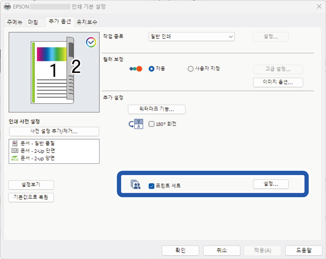 프린트 세트를 선택한 다음 설정을 클릭합니다.