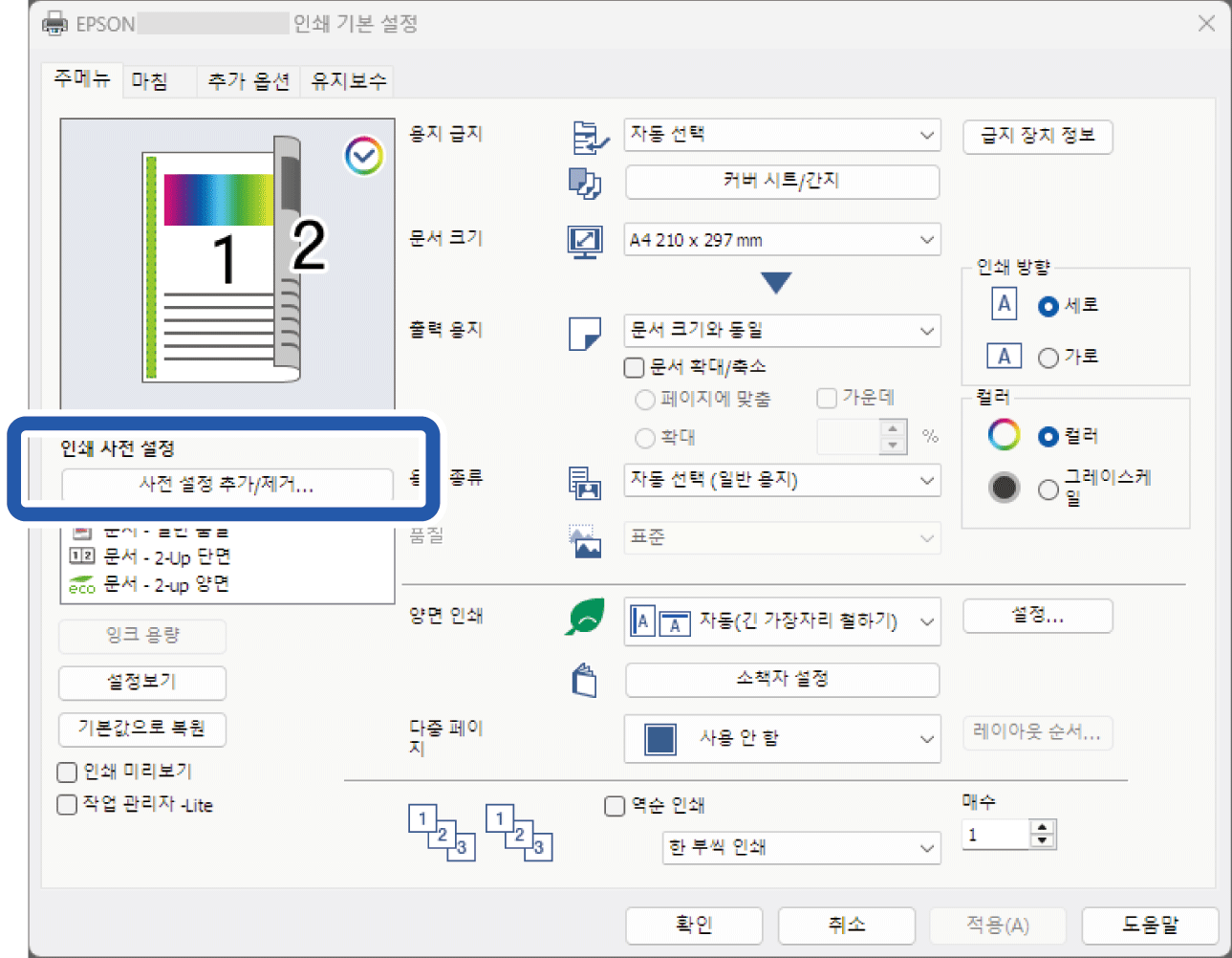 기본 또는 추가 옵션 탭에서 인쇄 사전 설정아래의 사전 설정 추가/제거를 클릭합니다.