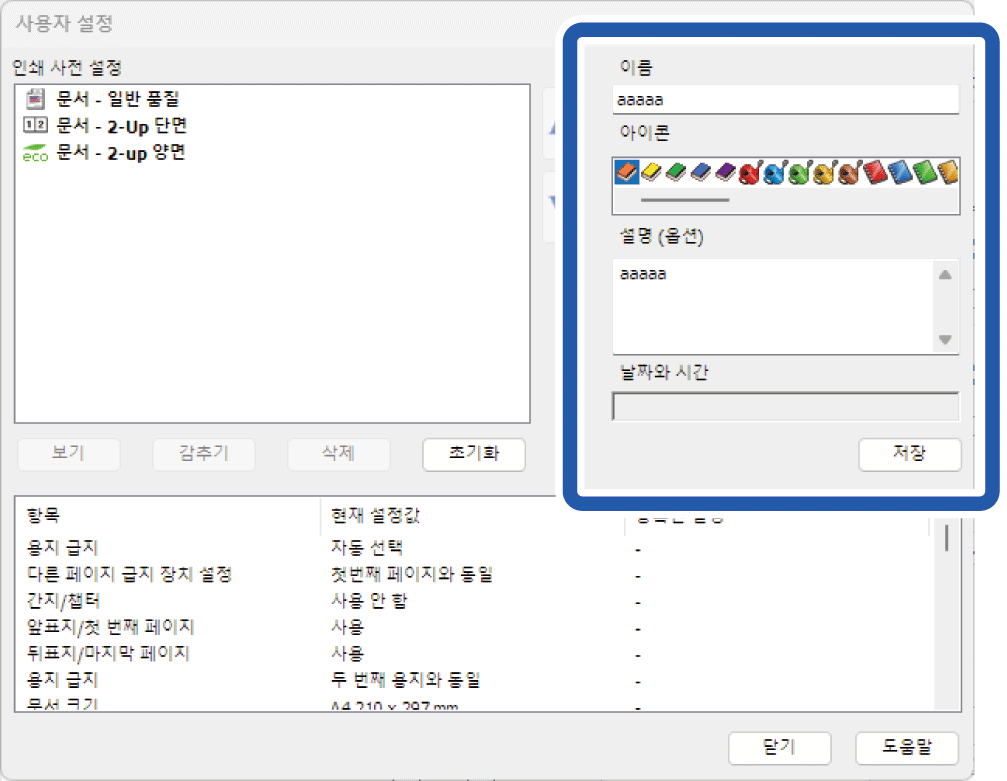 이름과 설명(선택 사항)을 입력한 다음 저장을 클릭하세요. 입력한 설정 이름이 인쇄 사전 설정에 추가됩니다.