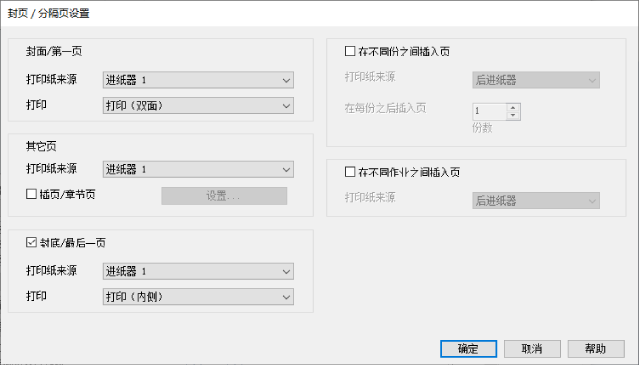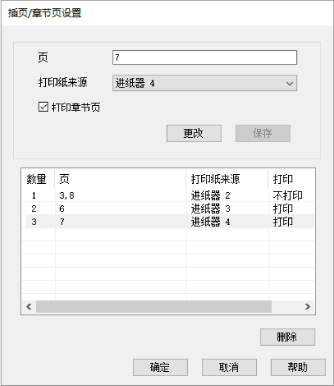 请注意,通过指定页码和打印纸来源插入的单页以及打印的纸张,不能设置为同一页。此外,部分页面可能为单面打印,具体取决于设置。
