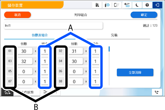 若多個班級需相同數量,則您可以透過變更「組數」(組計數)來將其歸為一組。例如,若上圖所示的組 01 與組 04 皆需相同數量,請將組 01 的組數設為 2,而非另行設定組 04。