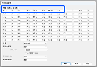在 [群組 (份數 x 組合數)] 中設定份數和組數。