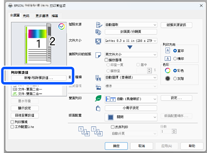 輸入 [名稱] 和 [備註(可不填寫)],然後按下 [儲存]。隨即會將您所輸入的設定名稱新增至 [列印預設值]。