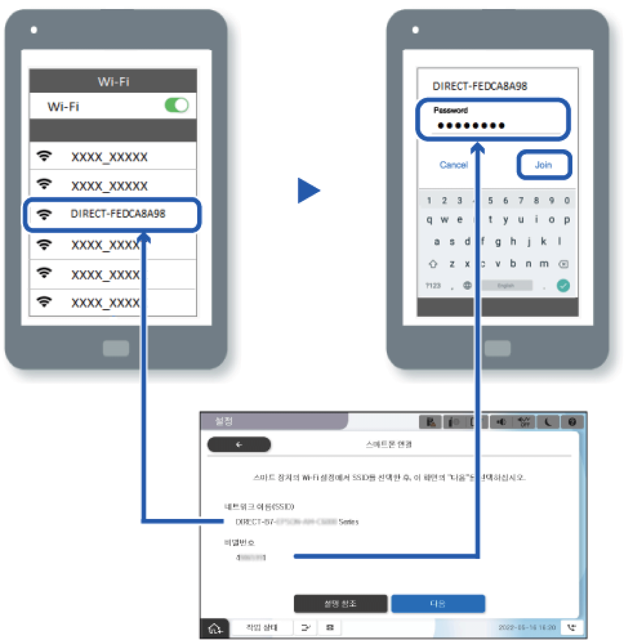 5. 스마트 기기의 Wi-Fi 화면에서 프린터 제어판에 표시된 SSID를 선택하고 비밀번호를 입력합니다.