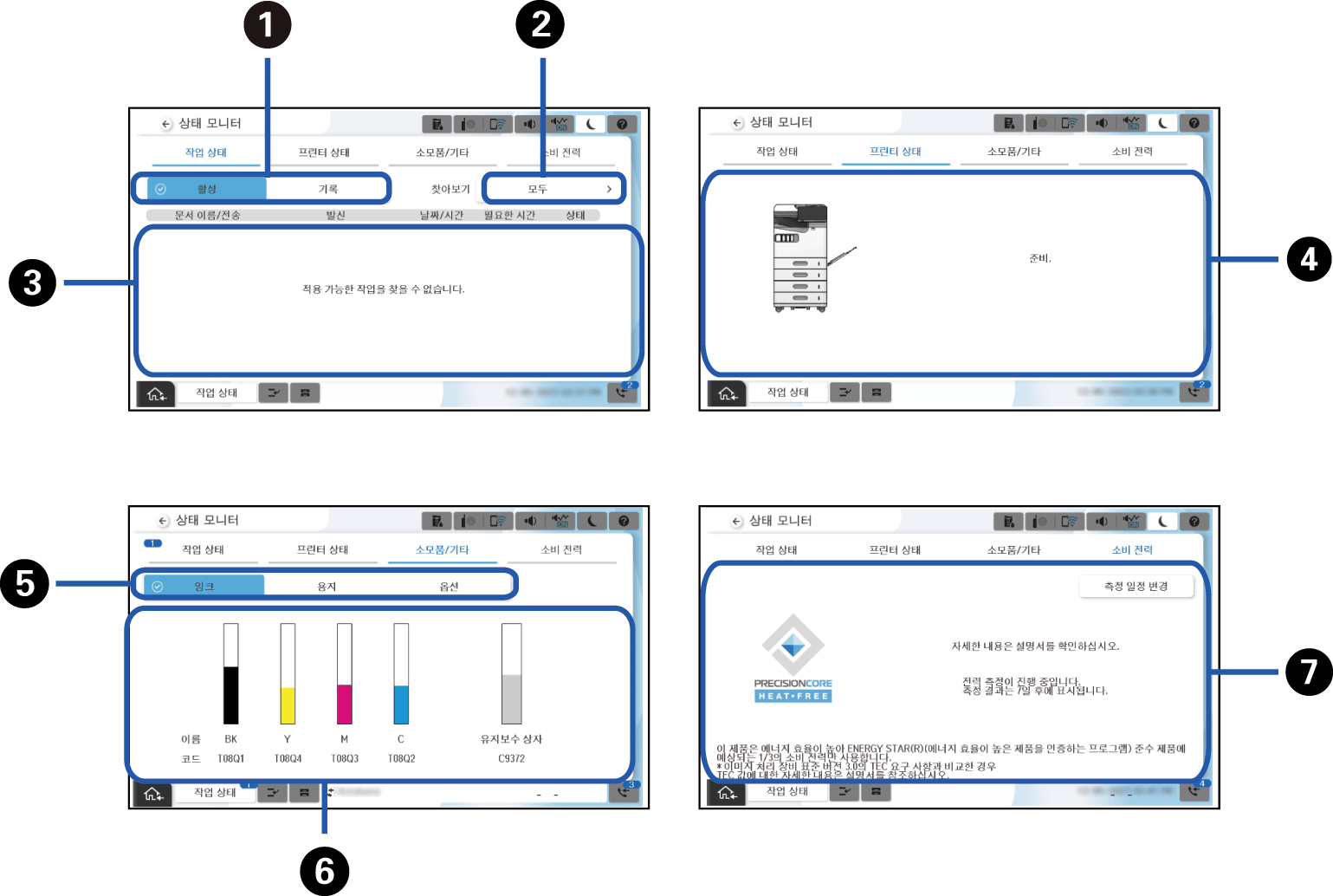 제어판에서 작업 상태를 선택하여 작업 상태 메뉴를 표시합니다. 프린터 또는 작업 상태를 확인할 수 있습니다.
