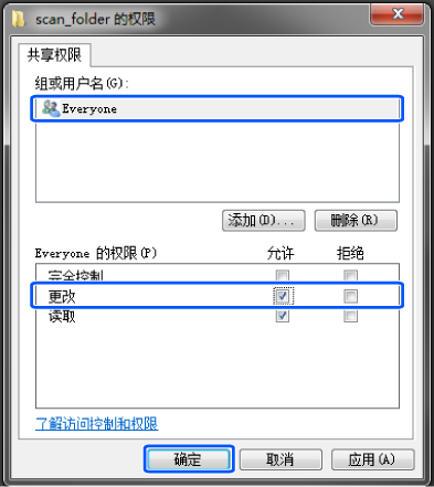 7. 组或用户名下选择 Everyone 组,接着在更改下选择允许,然后单击确定