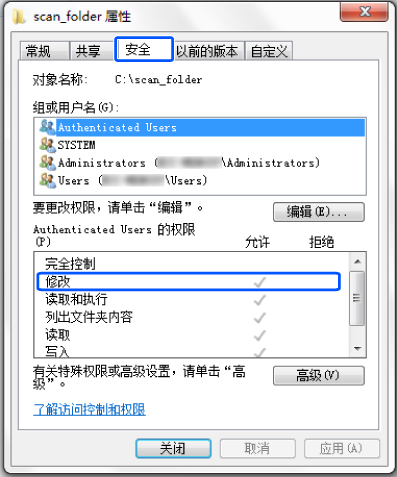 10. 确认已在 Authenticated Users 的权限下选中了修改对应的允许