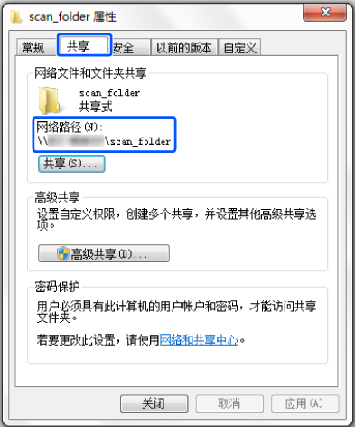 此时会显示共享文件夹的网络路径。注册本产品联系人时会使用此路径。请将此路径记录下来。