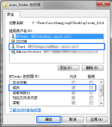 在权限屏幕上,选择在组或用户名中输入的用户名,接着在修改上选择访问权限,然后单击确定。