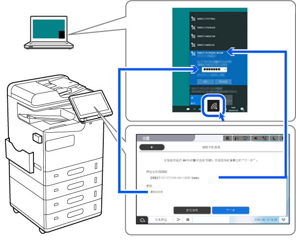 此时将显示本产品用于 Wi-Fi Direct 的网络名称 (SSID) 和密码。