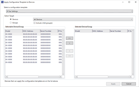 Выберыце прынтар, да якога вы неабходна прымяніць значэнне параметра, і прымяніце шаблон канфігурацыі.