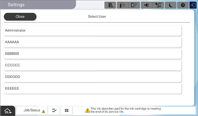 Гэта тлумачэнне — прыклад уваходу ў сістэму прынтара з уключанымі функцыямі панэлі адміністратара і кіравання доступам, калі зарэгістраваны адзін або некалькі карыстальнікаў. Змесціва на экране адрозніваецца ў залежнасці ад мадэлі і сітуацыі.