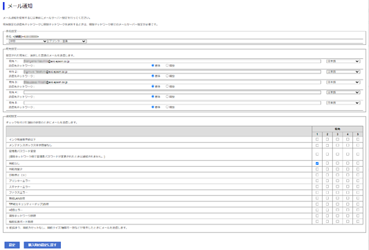 印刷停止やプリンターエラーなどのイベントが発生したときに、指定したアドレスにメールが送信されるようにメール通知を設定できます。宛先は5つまで登録でき、それぞれに受け取りたい通知を設定できます。