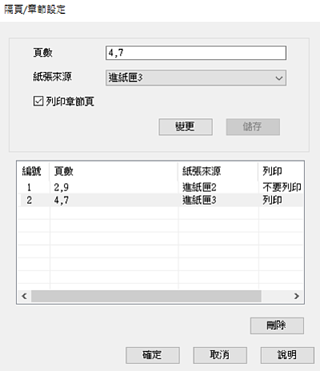 輸入您要在其處插入薄襯紙或列印章節的頁面。使用逗號分隔頁面,並使用連字符指定範圍。 例如:當您要在第 2 和 9 頁之前插入薄襯紙時,輸入「2,9」。當您要在章節紙上列印第 4 和 7 頁時,輸入「4,7」。如果您要在指定紙張來源的紙張上列印第 4 至 7 的連續頁面,輸入「4-7」。 |