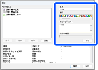 輸入 [名稱] 和 [備註(可不填寫)],然後按下 [儲存]。隨即會將您所輸入的設定名稱新增至 [列印預設值]。