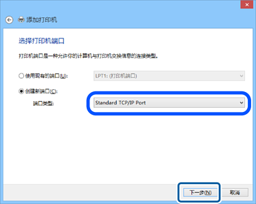 選取[建立新的連接埠],選取[標準 TCP/IP 連接埠]為連接埠類型,然後按一下[下一步]。