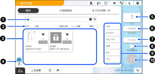顯示檔案縮略圖。如果已為檔案設定密碼,會顯示一個鑰匙圖示。 指明檔案由哪項功能儲存所得。