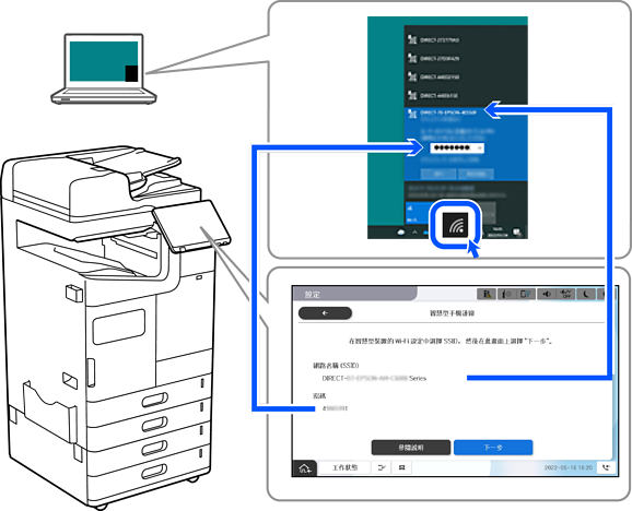 在電腦的網路連線畫面上,選取印表機控制面板上顯示的 SSID,然後輸入密碼。