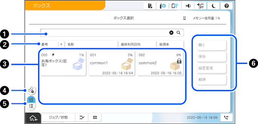 プリンターの操作パネルで[ボックス]を選択すると[ボックス一覧]が表示されます。