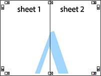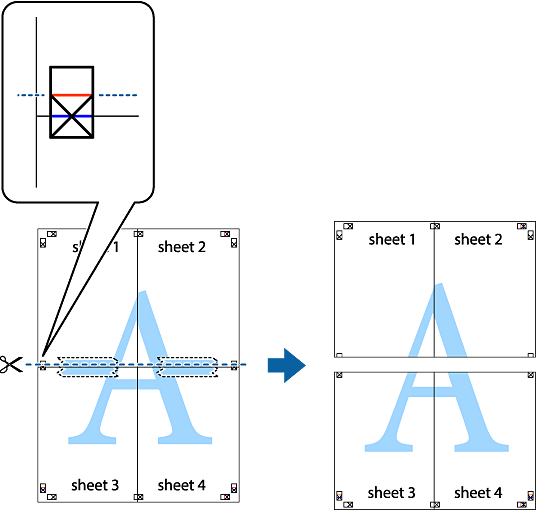 1. Sheet 1Sheet 2を用意します。Sheet 1を、×印と交わっている縦線(青色)を結ぶ線で切ります。