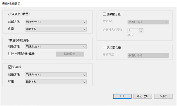 [OK]をクリックして詳細設定画面を閉じます。続いて[OK]をクリックして表紙・合紙設定画面を閉じます。